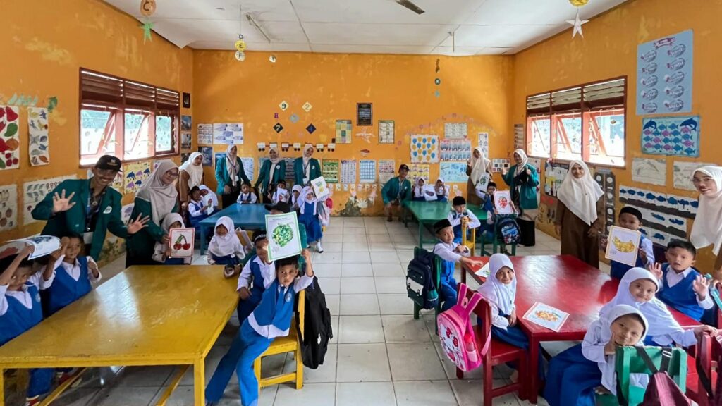 Momentum kolase yang membuat tangan anak-anak bersentuhan dengan lem dan material plastik dimanfaatkan sebagai titik masuk edukasi inti. Setelah proses kreatif selesai, mahasiswa KPM langsung mengajak seluruh murid mempraktikkan langkah-langkah mencuci tangan yang benar.